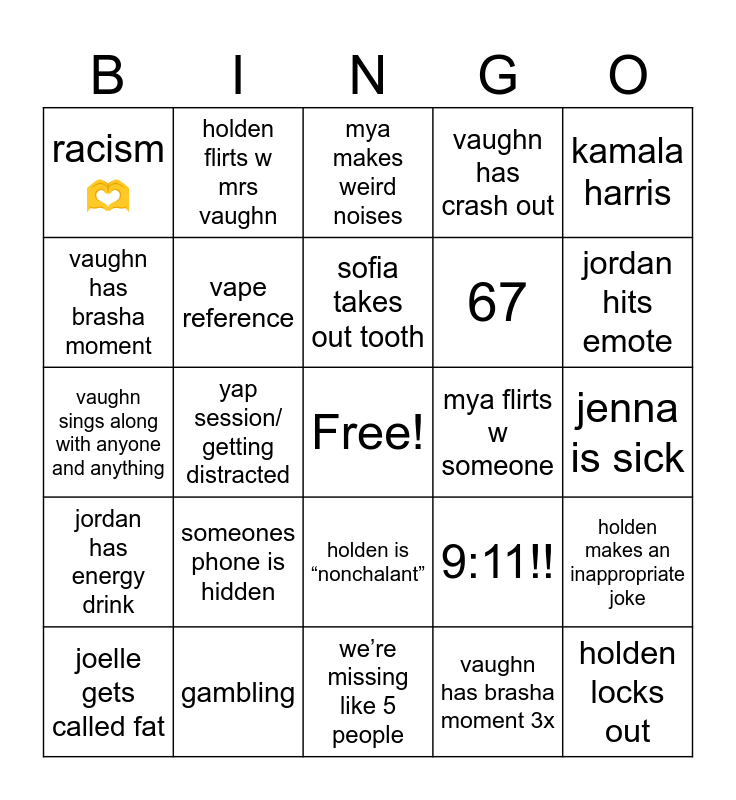 This bingo card has a free space and 24 words: someones phone is hidden, gambling, sofia takes out tooth, joelle gets called fat, kamala harris, racism 🫶, vaughn has brasha moment, holden flirts w mrs vaughn, mya flirts w someone, holden is “nonchalant”, 67, vaughn sings along with anyone and anything, 9:11!!, holden makes an inappropriate joke, vape reference, vaughn has brasha moment 3x, jenna is sick, mya makes weird noises, jordan hits emote, yap session/ getting distracted, holden locks out, jordan has energy drink, vaughn has crash out and we’re missing like 5 people.