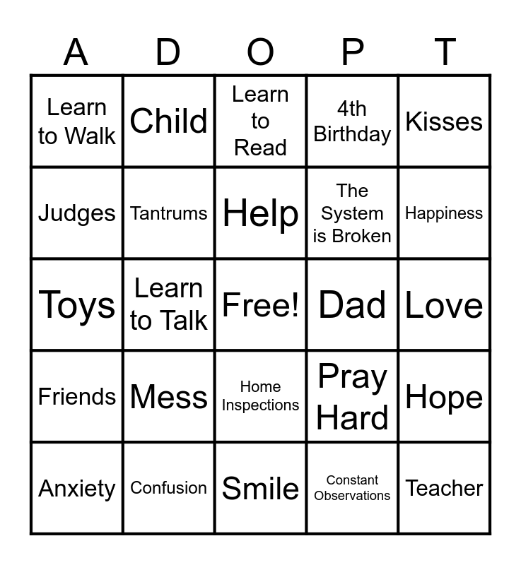 This bingo card has a free space and 65 words: Foster, Adopt, Wait Years and Years, Pray Hard, Love, Family, Child, Paperwork is Lost, The System is Broken, Support System, Friends, 2nd Birthday, 3rd Birthday, 4th Birthday, Milestones, Learn to Walk, Learn to Talk, Learn to Read, Hugs, Kisses, Toys, Mess, Smile, Cry, Wait, Blessing, Patience, Mom, Dad, Son, Anxiety, Trust, Emotional, Almost Lose Hope, Happiness, Happy Ending, Court Dates, Home Inspections, Parenting, Case Workers, Judges, Confusion, CMFCAA, Church, Fostering Hope Closet, Acceptance, Tantrums, Sleepless Nights, Worry, Hope, Powerless, Frustration, Endless Paperwork, Constant Observations, Joy, Fear, Depression, Help, Diapers, Teacher, Holidays, Memories, Hope for Change, Fix the System and God's Love.