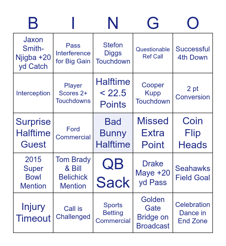 This bingo card has a free space and 24 words: Tom Brady & Bill Belichick Mention, Call is Challenged, Halftime < 22.5 Points, Injury Timeout, Successful 4th Down, Jaxon Smith-Njigba +20 yd Catch, Interception, Pass Interference for Big Gain, Missed Extra Point, QB Sack, Cooper Kupp Touchdown, Surprise Halftime Guest, Drake Maye +20 yd Pass, Seahawks Field Goal, Player Scores 2+ Touchdowns, Golden Gate Bridge on Broadcast, Coin Flip Heads, Stefon Diggs Touchdown, 2 pt Conversion, Ford Commercial, Celebration Dance in End Zone, 2015 Super Bowl Mention, Questionable Ref Call and Sports Betting Commercial.