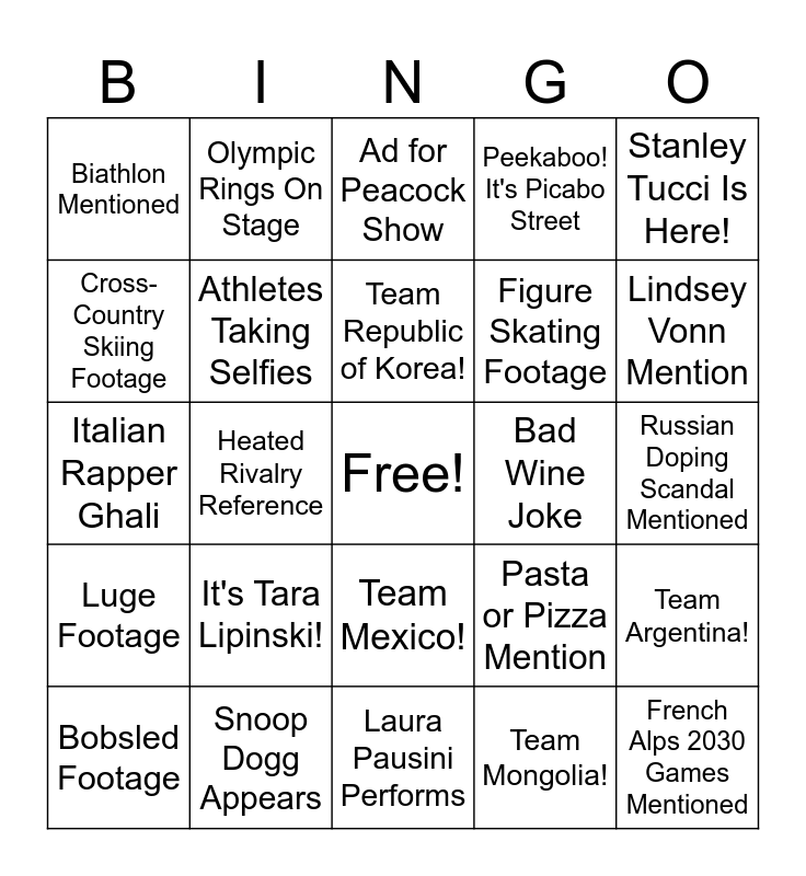 This bingo card has a free space and 83 words: "Heated Rivalry" Reference, "Skimo" Explained", Ad for Peacock Show, Alex Hall Appears, Alysa Liu Appears, Amber Glenn Appears, Ancient Rome Discussed, Andrea Bocelli SINGS!, Announcer Mangles Italian Word, Announcer Says How Cold It Is, Apollo Ohno Name Drop, Athlete Makes Heart Sign, Athletes Taking Selfies, Bad Wine Joke, Beautiful Mountain Shot, Biathlon Mentioned, Bobsled Footage, Cross-Country Skiing Footage, Curling Mentioned, Dua Lipa On Screen!, Fake Italian Accent, Figure Skating Footage, French Alps 2030 Games Mentioned, Gelato Joke, Heated Rivalry Reference, Ice Dancing Mentioned, Ilia Malinin Appears, It's Johnny Weir!, It's Shaun White!, It's Snoop Dogg!, It's Tara Lipinski!, Italian Flag Sighting, Italian History Segment, Italian Rapper Ghali, John Williams Olympics Theme, L.A. 2028 Games Mentioned, Laura Pausini Performs, Light Show as Part of Ceremony, Lindsey Vonn Mention, Luge Footage, Mariah Carey SINGS!, Mario Mentioned, Mary Carillo: She Back, Mascots Tina & Milo Appear, Mike Tirico via Remote, Miracle on Ice 1980 Mention, Olympic Rings On Stage, Olympic Scandal Discussed, Pairs Figure Skating Footage, Paralympics Mentioned, Pasta or Pizza Mention, Peekaboo! It's Picabo Street, Russian Doping Scandal Mentioned, Shot of a Ski Lift, Shot of the 2026 Medals, Skeleton Explained, Ski Jumping Mentioned, Slalom Footage, Snoop Dogg Appears, Snow In the Air, Snowboard Footage, Snowboard Halfpipe Footage, Speed Skating Footage, Stanley Tucci Is Here!, Super Bowl Ad, Team Argentina!, Team Belgium!, Team Canada!, Team Chile!, Team Finland!, Team Great Britain!, Team Greece!, Team Japan!, Team Mexico!, Team Mongolia!, Team Norway!, Team Poland!, Team Republic of Korea!, Team Ukraine!, Terry Gannon on the Mic, That Gal from "White Lotus", Tom Cruise is Here? and Uh Oh, Technical Difficulties.