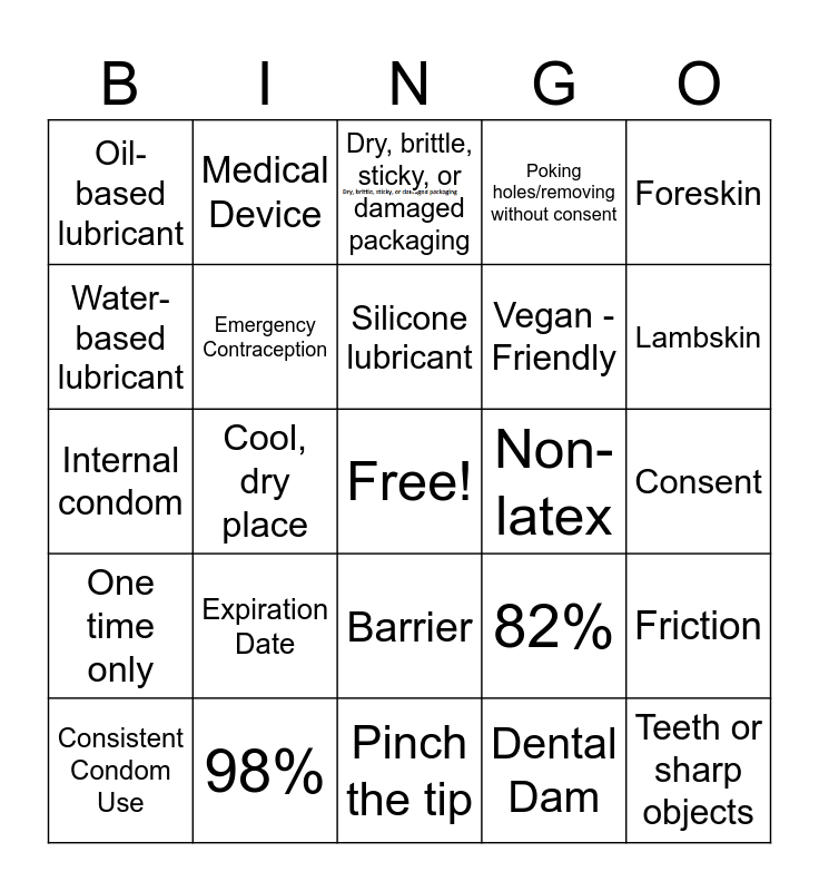 This bingo card has 1 images, a free space and 24 words: Expiration Date, 98%, Silicone lubricant, Consistent Condom Use, Foreskin, Oil-based lubricant, Water-based lubricant, Medical Device, Non-latex, Barrier, Vegan -Friendly, Internal condom, 82%, Friction, Emergency Contraception, Dental Dam, Consent, Dry, brittle, sticky, or damaged packaging, Lambskin, Cool, dry place, Teeth or sharp objects, One time only, Poking holes/removing without consent and Pinch the tip.