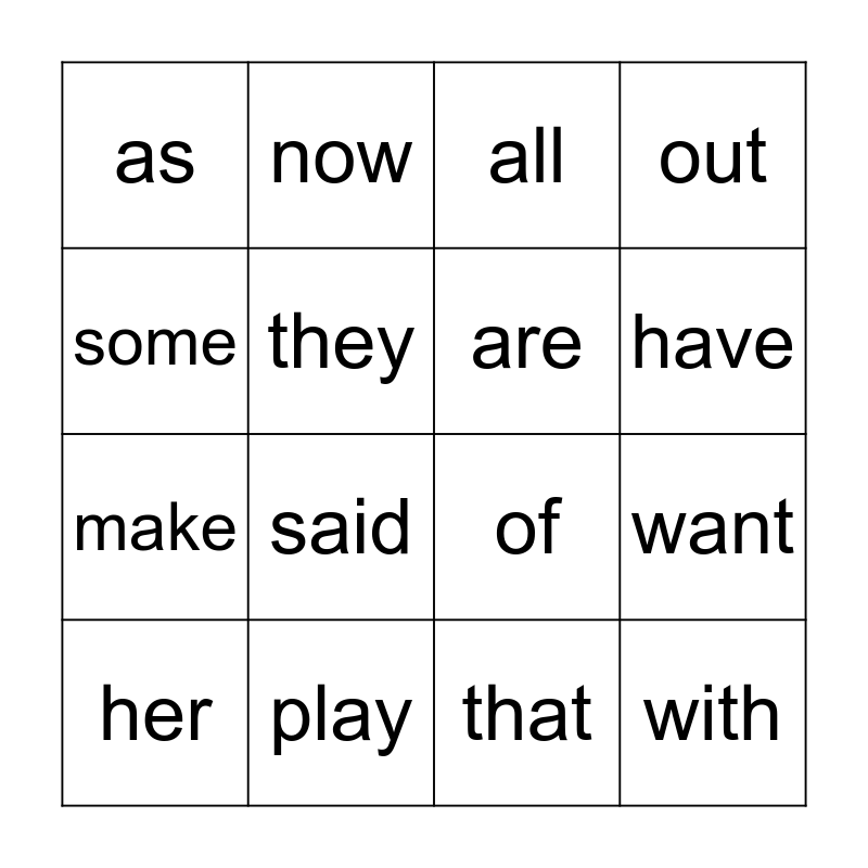 This bingo card has 16 words: play, want, all, as, make, now, of, that, some, they, her, out, said, have, are and with.