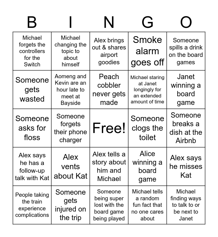 This bingo card has a free space and 24 words: Alex vents about Kat, Someone gets injured on the trip, Peach cobbler never gets made, People taking the train experience complications, Someone spills a drink on the board games, Michael forgets the controllers for the Switch, Someone gets wasted, Michael changing the topic to about himself, Someone clogs the toilet, Alex tells a story about him and Michael, Michael staring at Janet longingly for an extended amount of time, Someone asks for floss, Alice winning a board game, Alex says he misses Kat, Aomeng and Kevin are an hour late to meet at Bayside, Michael tells a random fun fact that no one cares about, Someone breaks a dish at the Airbnb, Alex brings out & shares airport goodies, Janet winning a board game, Someone forgets their phone charger, Michael finding ways to talk to or be next to Janet, Alex says he has a follow-up talk with Kat, Smoke alarm goes off and Someone being super lost with the board game being played.