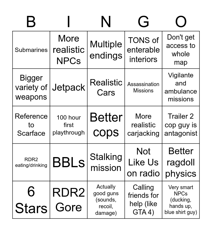 This bingo card has a free space and 24 words: BBLs, RDR2 Gore, Realistic Cars, 6 Stars, Don't get access to whole map, Submarines, Bigger variety of weapons, More realistic NPCs, More realistic carjacking, Stalking mission, Assassination Missions, Reference to Scarface, Not Like Us on radio, Better ragdoll physics, Jetpack, Calling friends for help (like GTA 4), Trailer 2 cop guy is antagonist, Multiple endings, Vigilante and ambulance missions, 100 hour first playthrough, Very smart NPCs (ducking, hands up, blue shirt guy), RDR2 eating/drinking, TONS of enterable interiors and Actually good guns (sounds, recoil, damage).