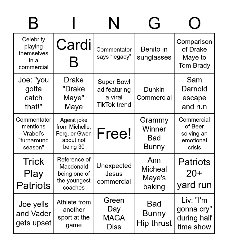 This bingo card has a free space and 34 words: Liv: "I love this song", Bad Bunny Hip thrust, Billie Joe Armstrong high jump, Joe: "DRAKE MAYE", Trick Play Patriots, Drake "Drake Maye" Maye, Comparison of Drake Maye to Tom Brady, Joe yells and Vader gets upset, Cardi B, Replay shown three times, Super Bowl ad featuring a viral TikTok trend, Commentator says “legacy”, "12" crowd noise mentioned on camera, Dorito's Commercial, Grammy Winner Bad Bunny, Sam Darnold escape and run, Athlete from another sport at the game, Commentator mentions Vrabel’s "turnaround season", Reference of Macdonald being one of the youngest coaches, Ann Micheal Maye's baking, Unexpected Jesus commercial, Animal wearing clothes in a commercial, Celebrity playing themselves in a commercial, Commercial of Beer solving an emotional crisis, Green Day MAGA Diss, Liv: "I'm gonna cry" during half time show, Benito in sunglasses, "anyone but the patriots" from Matt or Ferg, Dunkin Commercial, Joe: "you gotta catch that!", Commentator says "Historic", Ageist joke from Michelle, Ferg, or Gwen about not being 30, Patriots 20+ yard run and Drake Maye gets sacked.