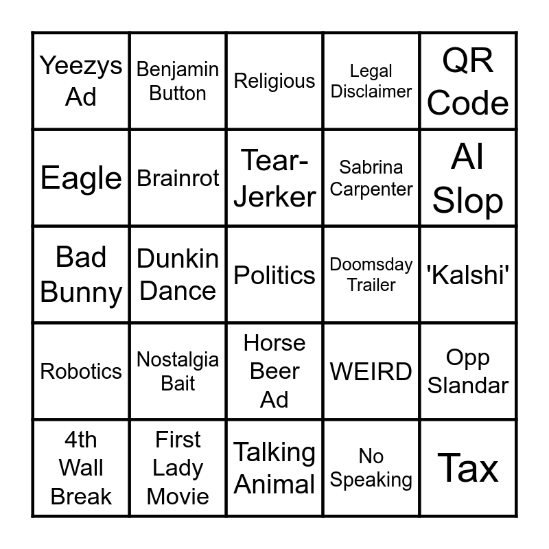 This bingo card has 25 words: Nostalgia Bait, Talking Animal, Tear-Jerker, 4th Wall Break, QR Code, Yeezys Ad, Eagle, Benjamin Button, Doomsday Trailer, Horse Beer Ad, Sabrina Carpenter, Bad Bunny, WEIRD, Opp Slandar, Brainrot, Tax, 'Kalshi', Religious, AI Slop, Dunkin Dance, Politics, First Lady Movie, Robotics, Legal Disclaimer and No Speaking.