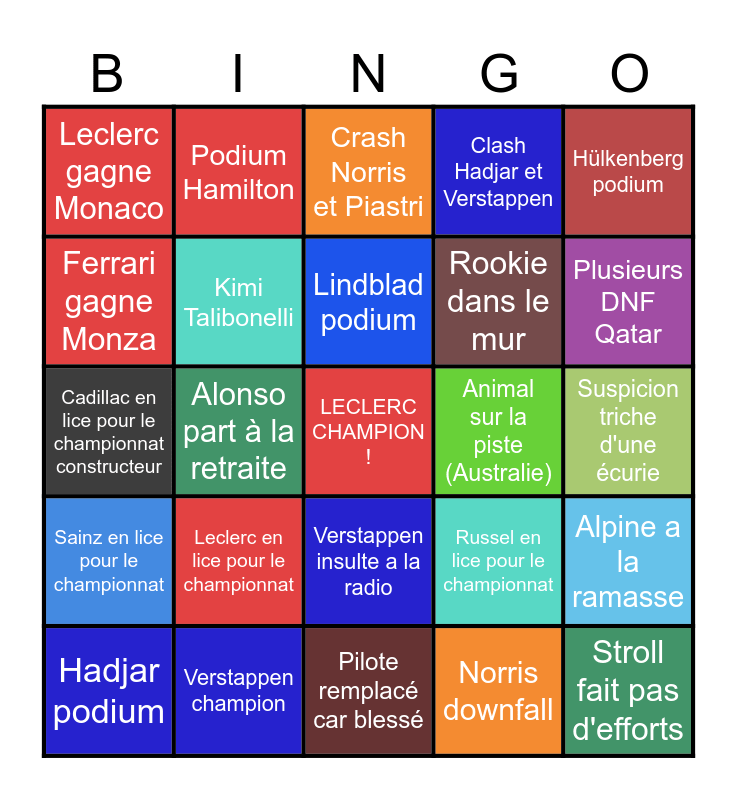 This bingo card has a free space and 24 words: Leclerc en lice pour le championnat, Verstappen champion, Lindblad podium, Hadjar podium, Hülkenberg podium, Leclerc gagne Monaco, Ferrari gagne Monza, Podium Hamilton, Animal sur la piste (Australie), Verstappen insulte a la radio, Rookie dans le mur, Cadillac en lice pour le championnat constructeur, Russel en lice pour le championnat, Alpine a la ramasse, Kimi Talibonelli, Norris downfall, Suspicion triche d'une écurie, Crash Norris et Piastri, Plusieurs DNF Qatar, Alonso part à la retraite, Stroll fait pas d'efforts, Sainz en lice pour le championnat, Clash Hadjar et Verstappen and Pilote remplacé car blessé.