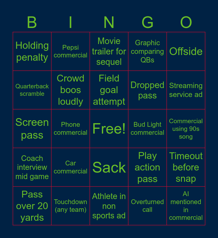 This bingo card has a free space and 24 words: Car commercial, Touchdown (any team), Field goal attempt, Pass over 20 yards, Offside, Holding penalty, Quarterback scramble, Pepsi commercial, Bud Light commercial, Sack, Dropped pass, Screen pass, Play action pass, Timeout before snap, Crowd boos loudly, Overturned call, Commercial using 90s song, Movie trailer for sequel, Streaming service ad, Phone commercial, AI mentioned in commercial, Coach interview mid game, Graphic comparing QBs and Athlete in non sports ad.