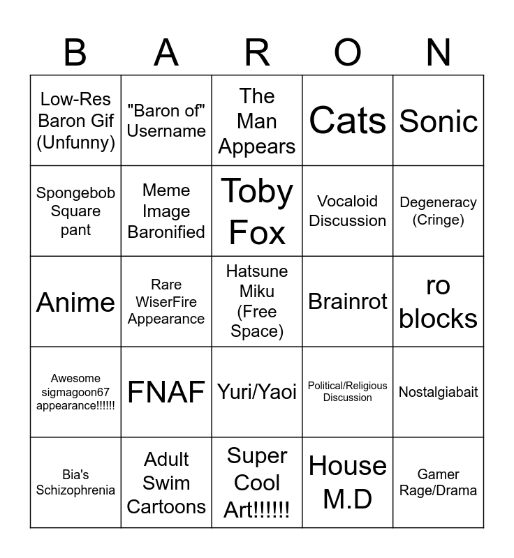 This bingo card has a free space and 24 words: FNAF, Adult Swim Cartoons, Toby Fox, Bia's Schizophrenia, Sonic, Low-Res Baron Gif (Unfunny), Spongebob Square pant, "Baron of" Username, Brainrot, Yuri/Yaoi, Vocaloid Discussion, Anime, Political/Religious Discussion, Nostalgiabait, Meme Image Baronified, House M.D, ro blocks, The Man Appears, Degeneracy (Cringe), Rare WiserFire Appearance, Gamer Rage/Drama, Awesome sigmagoon67 appearance!!!!!!, Cats and Super Cool Art!!!!!!.