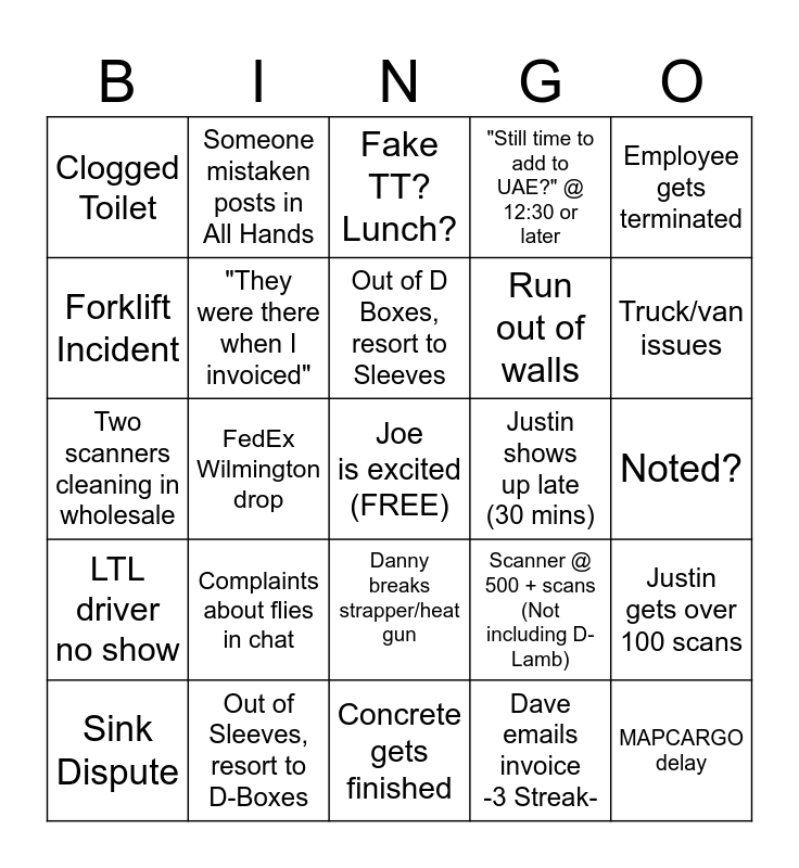 This bingo card has a free space and 24 words: Complaints about flies in chat, Out of Sleeves, resort to D-Boxes, Out of D Boxes, resort to Sleeves, Sink Dispute, Employee gets terminated, Clogged Toilet, Forklift Incident, Someone mistaken posts in All Hands, Justin shows up late (30 mins), Danny breaks strapper/heat gun, Run out of walls, Two scanners cleaning in wholesale, Scanner @ 500 + scans (Not including D-Lamb), Justin gets over 100 scans, "They were there when I invoiced", Dave emails invoice -3 Streak-, Noted?, Fake TT? Lunch?, Truck/van issues, FedEx Wilmington drop, MAPCARGO delay, LTL driver no show, "Still time to add to UAE?" @ 12:30 or later and Concrete gets finished.