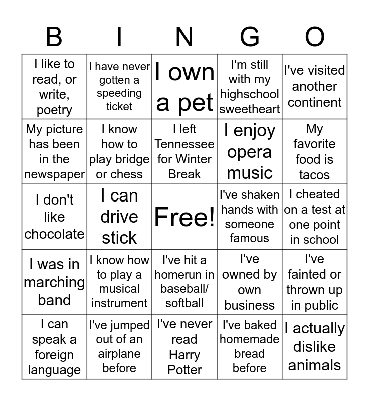 This bingo card has a free space and 24 words: I know how to play a musical instrument, I've jumped out of an airplane before, I left Tennessee for Winter Break, I can speak a foreign language, I've visited another continent, I like to read, or write, poetry, My picture has been in the newspaper, I have never gotten a speeding ticket, I've shaken hands with someone famous, I've hit a homerun in baseball/ softball, I enjoy opera music, I don't like chocolate, I've owned by own business, I've fainted or thrown up in public, I know how to play bridge or chess, I've baked homemade bread before, I cheated on a test at one point in school, I own a pet, My favorite food is tacos, I can drive stick, I actually dislike animals, I was in marching band, I'm still with my highschool sweetheart and I've never read Harry Potter.