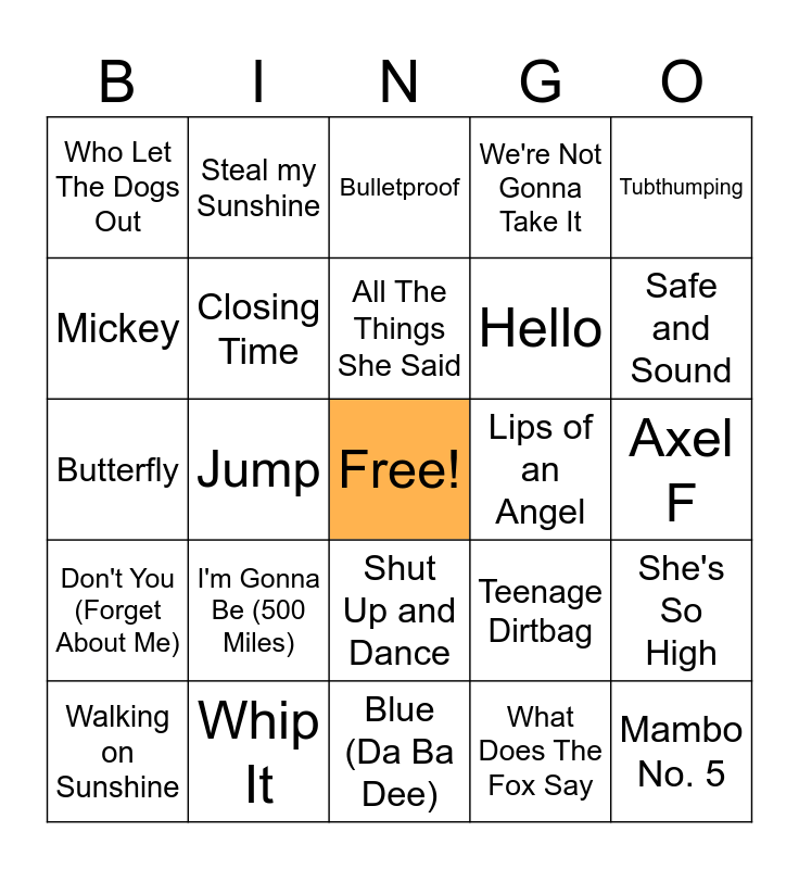 This bingo card has a free space and 29 words: Walking on Sunshine, Tainted Love, Jump, Somebody That I Used To Know, Who Let The Dogs Out, Bulletproof, Closing Time, I'm Gonna Be (500 Miles), Lips of an Angel, Whip It, Axel F, Mambo No. 5, Blue (Da Ba Dee), What Does The Fox Say, Safe and Sound, Whip my Hair, Shut Up and Dance, Don't You (Forget About Me), Tubthumping, Butterfly, Teenage Dirtbag, Headstrong, Hello, Mickey, We're Not Gonna Take It, Steal my Sunshine, She's So High, All The Things She Said and The Reason.
