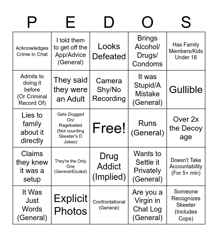 This bingo card has a free space and 24 words: They're the Only One (General/Eluded), Explicit Photos, Camera Shy/No Recording, It Was Just Words (General), Has Family Members/Kids Under 18, Acknowledges Crime in Chat, Admits to doing it before (Or Criminal Record Of), I told them to get off the App/Advice (General), Runs (General), Drug Addict (Implied), It was Stupid/A Mistake (General), Lies to family about it directly, Wants to Settle it Privately (General), Doesn't Take Accountability (For 5+ min), They said they were an Adult, Are you a Virgin in Chat Log (General), Over 2x the Decoy age, Looks Defeated, Gullible, Gets Dogged On/ Ragebaited (Not counting Skeeter's D Jokes), Someone Recognizes Skeeter (Includes Cops), Claims they knew it was a setup, Brings Alcohol/ Drugs/ Condoms and Confrontational (General).