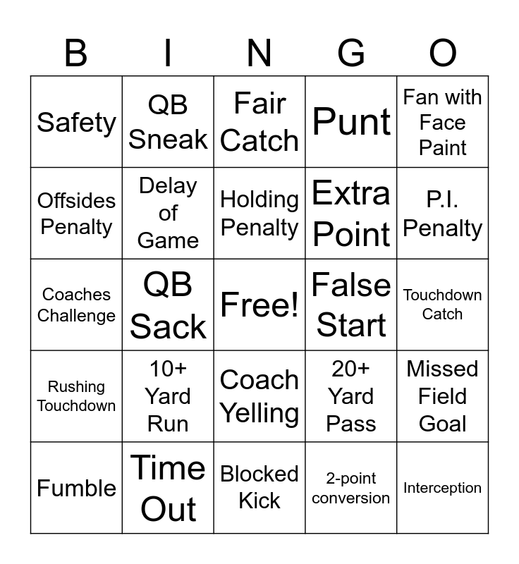 This bingo card has a free space and 27 words: 20+ Yard Pass, Field Goal, Extra Point, Blocked Kick, Offsides Penalty, Fair Catch, QB Sneak, Rushing Touchdown, False Start, Missed Field Goal, Coaches Challenge, Punt, Fumble, Time Out, P.I. Penalty, Pick Six, Delay of Game, Holding Penalty, 10+ Yard Run, Safety, Touchdown Catch, 2-point conversion, QB Sack, Interception, Coach Yelling, Fan with Face Paint and 50+ Yard Field Goal.
