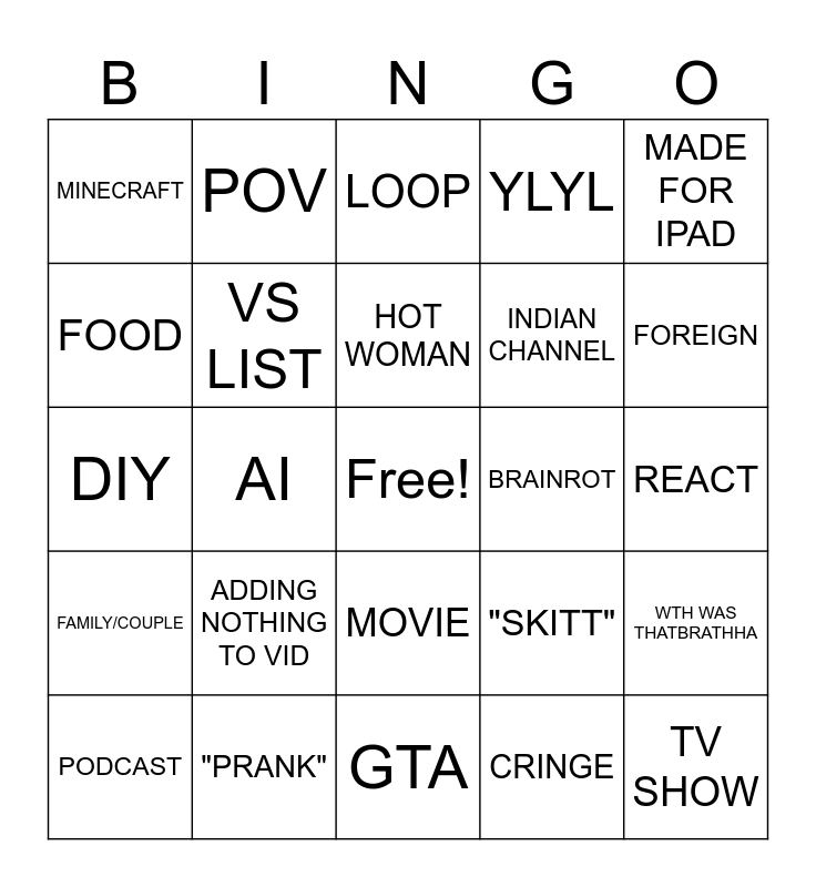 This bingo card has a free space and 24 words: PODCAST, ADDING NOTHING TO VID, HOT WOMAN, CRINGE, MADE FOR IPAD, MINECRAFT, POV, LOOP, BRAINROT, REACT, DIY, VS LIST, "SKITT", WTH WAS THATBRATHHA, FOOD, "PRANK", GTA, YLYL, FOREIGN, FAMILY/COUPLE, AI, MOVIE, INDIAN CHANNEL and TV SHOW.