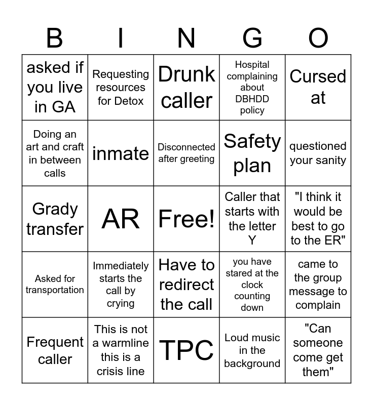 This bingo card has a free space and 24 words: Frequent caller, Immediately starts the call by crying, Disconnected after greeting, Loud music in the background, Cursed at, asked if you live in GA, Requesting resources for Detox, Drunk caller, Caller that starts with the letter Y, "I think it would be best to go to the ER", Grady transfer, inmate, you have stared at the clock counting down, came to the group message to complain, Doing an art and craft in between calls, This is not a warmline this is a crisis line, TPC, Hospital complaining about DBHDD policy, questioned your sanity, Asked for transportation, AR, Have to redirect the call, Safety plan and "Can someone come get them".