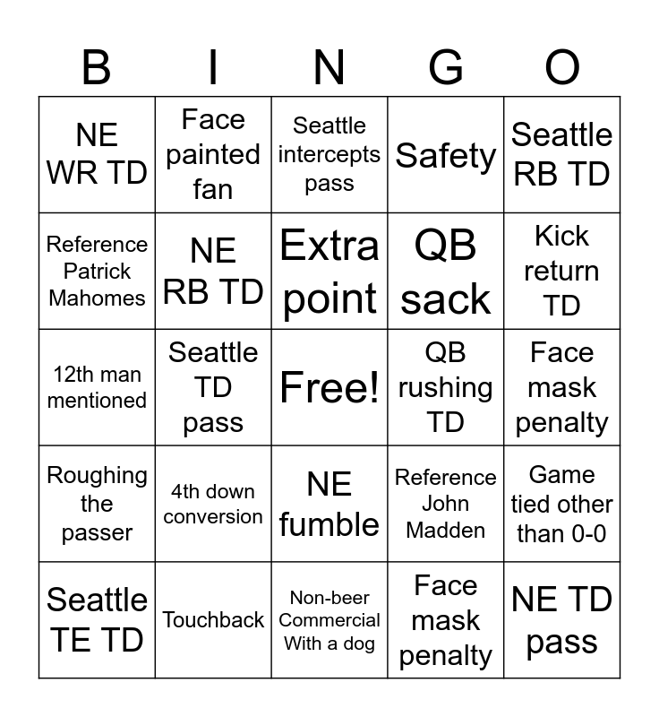 This bingo card has a free space and 39 words: NE field goal, 2-pt conversion, Seattle fumble, NE RB TD, Seattle TE TD, NE fumble, Extra point, NE TE TD, Seattle RB TD, Roughing the passer, Seattle TD pass, Safety, NE TD pass, Face mask penalty, QB rushing TD, 4th down conversion, Seattle WR TD, NE WR TD, 35+ yard play, Reference John Madden, Reference Patrick Mahomes, Non-beer Commercial With a dog, QB sack, Kick return TD, Beer commercial, Jason Kelce sighting, Lay’s commercial, Cartoon character, Truck in commercisl, Face painted fan, Unsportsmanlike conduct penalty, NE intercepts pass, Seattle intercepts pass, Touchback, Face mask penalty, Official falls down, Game tied other than 0-0, 12th man mentioned and Shirtless fan.