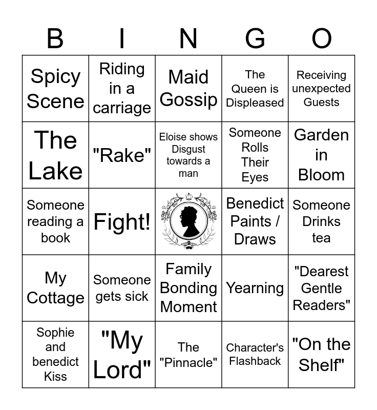 This bingo card has a free space and 29 words: Sophie and benedict Kiss, Someone Uses a fan, Fight!, "Sophie", Spicy Scene, Maid Gossip, "Rake", Someone gets sick, Benedict Paints / Draws, "My Lord", Someone Drinks tea, "On the Shelf", The "Pinnacle", Character's Flashback, Garden in Bloom, Penelope Writes, Family Bonding Moment, My Cottage, Receiving unexpected Guests, Someone reading a book, Yearning, Promenading in the park, Someone Rolls Their Eyes, The Lake, The Queen is Displeased, Riding in a carriage, "Dearest Gentle Readers", Eloise shows Disgust towards a man and Longing look from across a room.