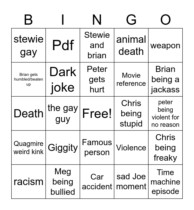 This bingo card has a free space and 24 words: Giggity, Meg being bullied, Peter gets hurt, racism, weapon, stewie gay, Brian gets humbled/beaten up, Pdf, Chris being stupid, Famous person, Movie reference, Death, Violence, Chris being freaky, Dark joke, sad Joe moment, peter being violent for no reason, Stewie and brian, Brian being a jackass, the gay guy, Time machine episode, Quagmire weird kink, animal death and Car accident.