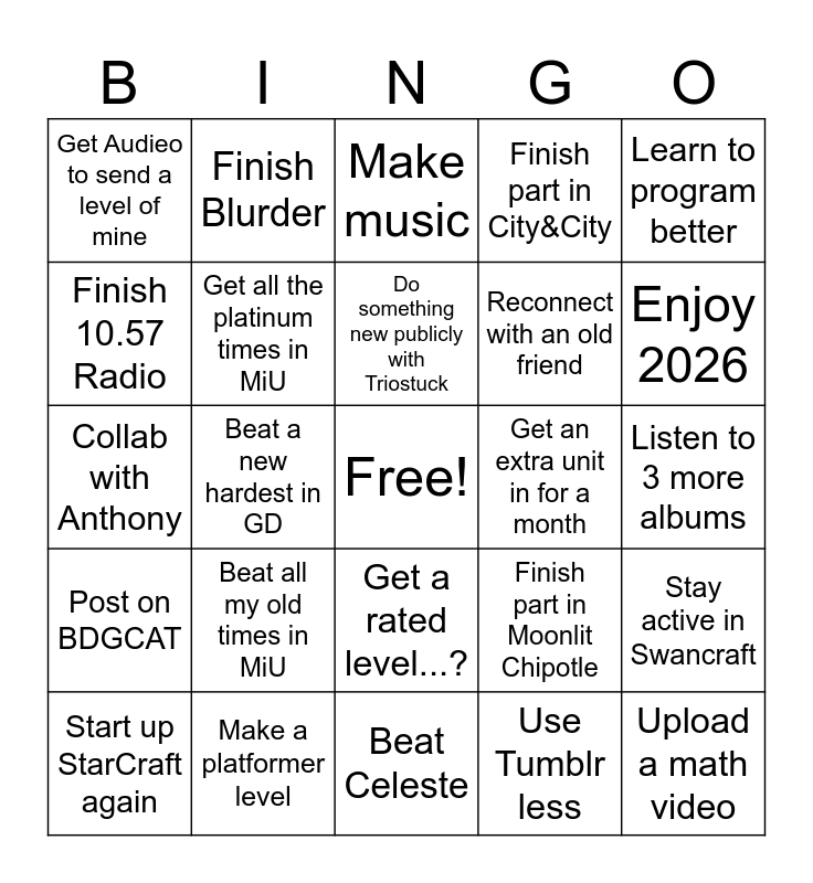 This bingo card has a free space and 24 words: Beat all my old times in MiU, Make a platformer level, Do something new publicly with Triostuck, Start up StarCraft again, Learn to program better, Get Audieo to send a level of mine, Finish 10.57 Radio, Finish Blurder, Get an extra unit in for a month, Get a rated level...?, Reconnect with an old friend, Collab with Anthony, Finish part in Moonlit Chipotle, Stay active in Swancraft, Get all the platinum times in MiU, Use Tumblr less, Listen to 3 more albums, Make music, Enjoy 2026, Beat a new hardest in GD, Upload a math video, Post on BDGCAT, Finish part in City&City and Beat Celeste.
