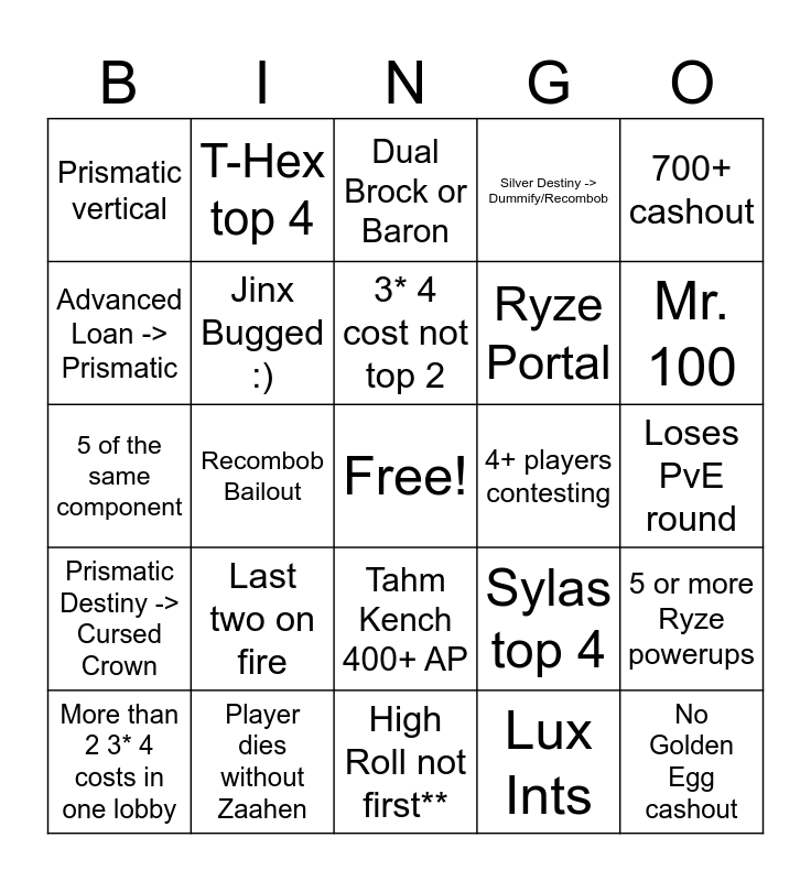 This bingo card has a free space and 24 words: Last two on fire, Player dies without Zaahen, 3* 4 cost not top 2, More than 2 3* 4 costs in one lobby, 700+ cashout, Prismatic vertical, Advanced Loan -> Prismatic, T-Hex top 4, 4+ players contesting, Tahm Kench 400+ AP, Ryze Portal, 5 of the same component, Sylas top 4, 5 or more Ryze powerups, Jinx Bugged :), Lux Ints, Loses PvE round, Dual Brock or Baron, Mr. 100, Recombob Bailout, No Golden Egg cashout, Prismatic Destiny -> Cursed Crown, Silver Destiny -> Dummify/Recombob and High Roll not first**.
