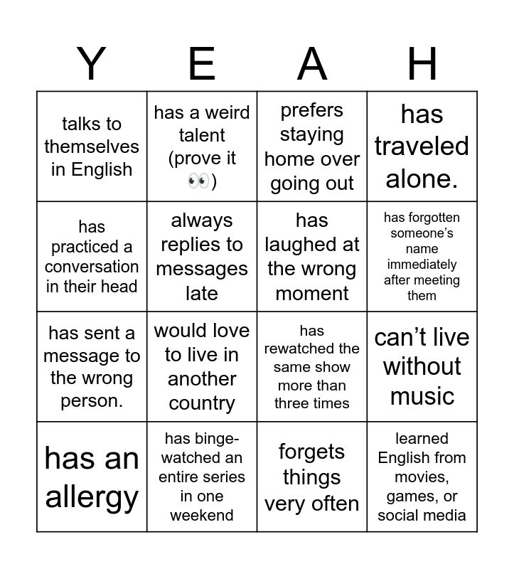 This bingo card has 16 words: has binge-watched an entire series in one weekend, can’t live without music, prefers staying home over going out, talks to themselves in English, has sent a message to the wrong person., has a weird talent (prove it 👀), has rewatched the same show more than three times, forgets things very often, has practiced a conversation in their head, always replies to messages late, has an allergy, has traveled alone., would love to live in another country, has forgotten someone’s name immediately after meeting them, has laughed at the wrong moment and learned English from movies, games, or social media.