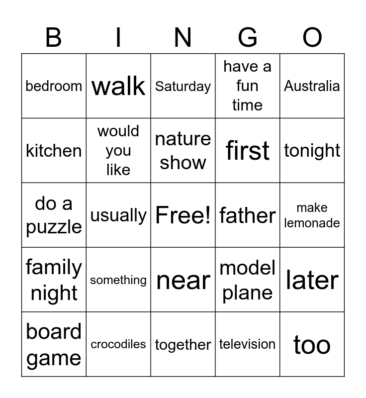 This bingo card has a free space and 26 words: near, television, nature show, crocodiles, Australia, bedroom, kitchen, walk, make lemonade, model plane, first, do a puzzle, later, board game, usually, watch TV, have a fun time, family night, Saturday, too, tonight, together, father, something, would you like and smile.