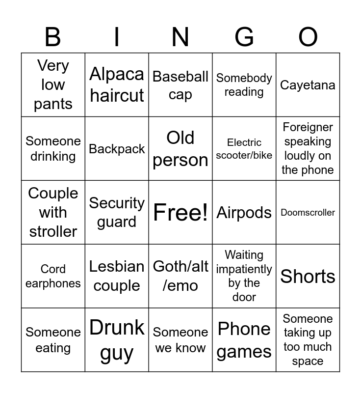 This bingo card has a free space and 24 words: Lesbian couple, Drunk guy, Old person, Someone eating, Cayetana, Very low pants, Someone drinking, Alpaca haircut, Airpods, Goth/alt /emo, Electric scooter/bike, Couple with stroller, Waiting impatiently by the door, Shorts, Backpack, Phone games, Doomscroller, Baseball cap, Foreigner speaking loudly on the phone, Security guard, Someone taking up too much space, Cord earphones, Somebody reading and Someone we know.