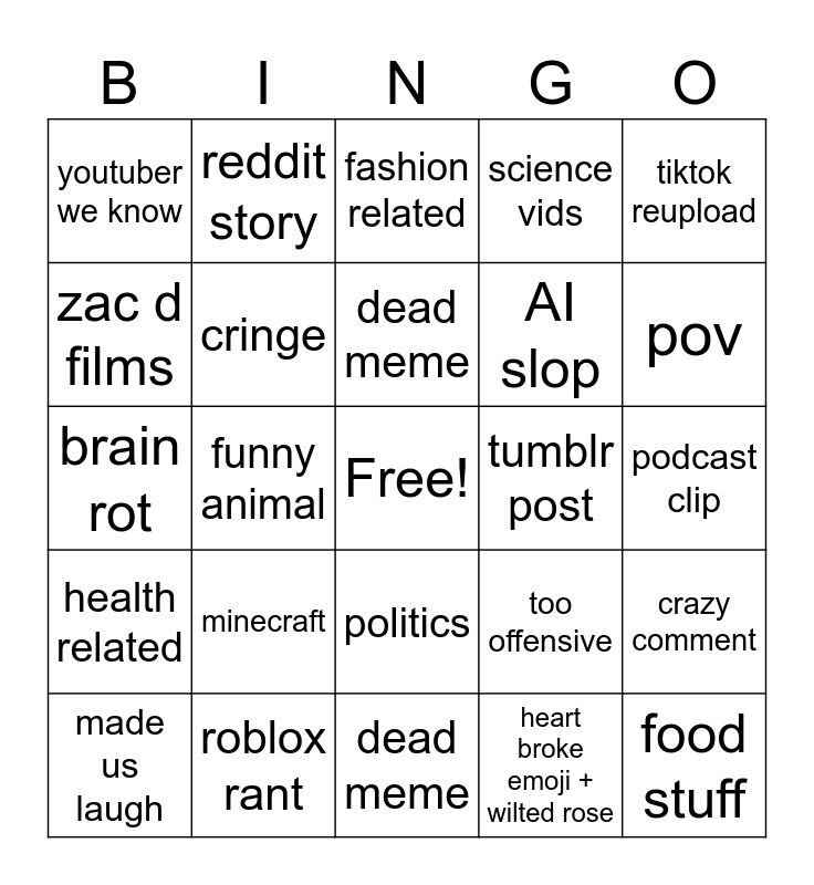This bingo card has a free space and 24 words: minecraft, roblox rant, dead meme, made us laugh, tiktok reupload, youtuber we know, zac d films, reddit story, tumblr post, politics, AI slop, brain rot, too offensive, crazy comment, cringe, heart broke emoji + wilted rose, podcast clip, fashion related, pov, funny animal, food stuff, health related, science vids and dead meme.