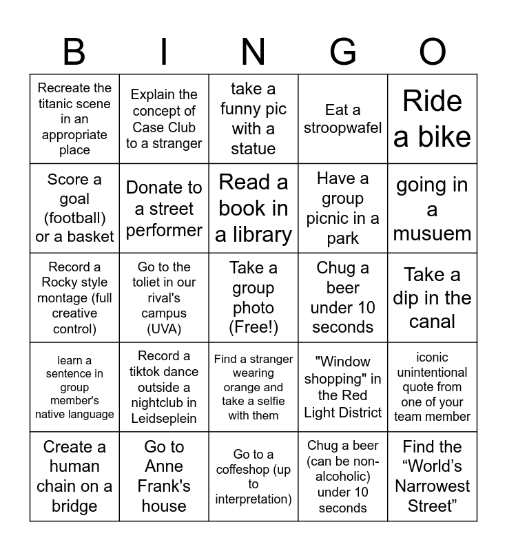 This bingo card has a free space and 24 words: Record a tiktok dance outside a nightclub in Leidseplein, Go to Anne Frank's house, Read a book in a library, Create a human chain on a bridge, Ride a bike, Recreate the titanic scene in an appropriate place, Score a goal (football) or a basket, Explain the concept of Case Club to a stranger, Chug a beer under 10 seconds, Find a stranger wearing orange and take a selfie with them, Have a group picnic in a park, Record a Rocky style montage (full creative control), "Window shopping" in the Red Light District, iconic unintentional quote from one of your team member, Donate to a street performer, Chug a beer (can be non- alcoholic) under 10 seconds, Take a dip in the canal, take a funny pic with a statue, going in a musuem, Go to the toliet in our rival's campus (UVA), Find the “World’s Narrowest Street”, learn a sentence in group member's native language, Eat a stroopwafel and Go to a coffeshop (up to interpretation).