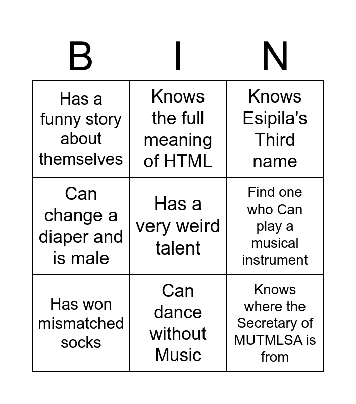 This bingo card has a free space and 8 words: Find one who Can play a musical instrument, Knows Esipila's Third name, Knows the full meaning of HTML, Has won mismatched socks, Has a funny story about themselves, Knows where the Secretary of MUTMLSA is from, Can change a diaper and is male and Can dance without Music.