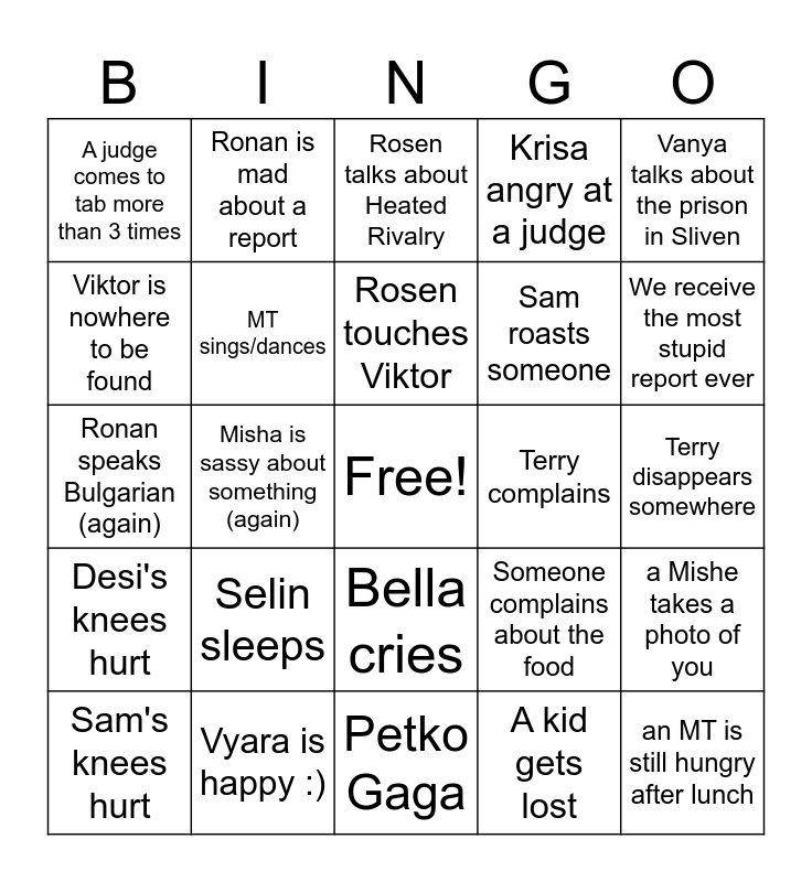 This bingo card has a free space and 24 words: Selin sleeps, Vyara is happy :), Rosen touches Viktor, Sam's knees hurt, Vanya talks about the prison in Sliven, A judge comes to tab more than 3 times, Viktor is nowhere to be found, Ronan is mad about a report, Terry complains, Bella cries, Sam roasts someone, Ronan speaks Bulgarian (again), Someone complains about the food, a Mishe takes a photo of you, MT sings/dances, A kid gets lost, Terry disappears somewhere, Rosen talks about Heated Rivalry, We receive the most stupid report ever, Misha is sassy about something (again), an MT is still hungry after lunch, Desi's knees hurt, Krisa angry at a judge and Petko Gaga.