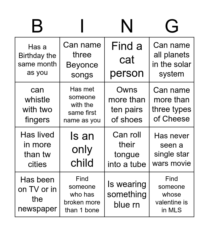 This bingo card has 16 words: Find someone who has broken more than 1 bone, Has never seen a single star wars movie, Find a cat person, Has a Birthday the same month as you, Has lived in more than tw cities, Can name three Beyonce songs, Can roll their tongue into a tube, Is wearing something blue rn, can whistle with two fingers, Has met someone with the same first name as you, Has been on TV or in the newspaper, Can name all planets in the solar system, Is an only child, Can name more than three types of Cheese, Owns more than ten pairs of shoes and Find someone whose valentine is in MLS.
