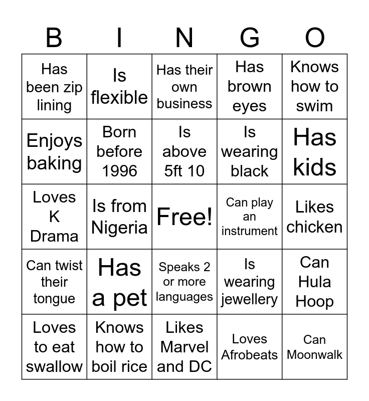 This bingo card has a free space and 24 words: Has a pet, Knows how to boil rice, Is above 5ft 10, Loves to eat swallow, Knows how to swim, Has been zip lining, Enjoys baking, Is flexible, Can play an instrument, Speaks 2 or more languages, Is wearing black, Loves K Drama, Is wearing jewellery, Can Hula Hoop, Born before 1996, Loves Afrobeats, Likes chicken, Has their own business, Has kids, Is from Nigeria, Can Moonwalk, Can twist their tongue, Has brown eyes and Likes Marvel and DC.