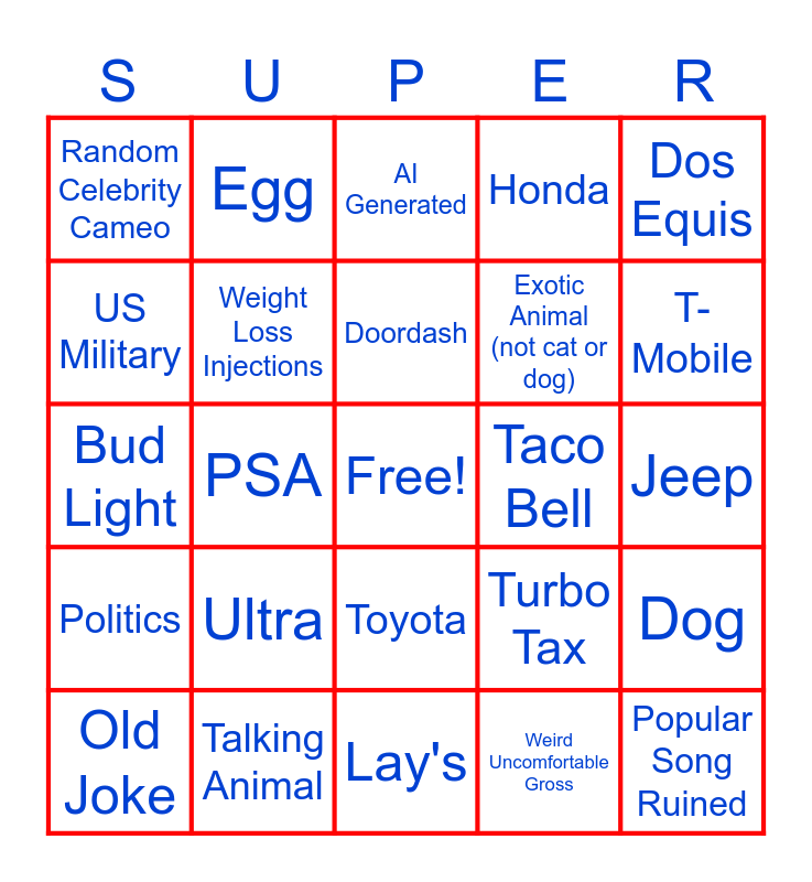This bingo card has a free space and 35 words: Doritos, Jesus, Sports Betting, Weight Loss Injections, Toyota, Honda, US Military, Chinese Company, Doordash, GrubHub, Bud Light, Dos Equis, Bad Acting from NFL Player, Movie Trailer, Random Celebrity Cameo, Taco Bell, Weird Uncomfortable Gross, PSA, Politics, Popular Song Ruined, Turbo Tax, Old Joke, Dog, Talking Animal, AI Generated, T-Mobile, M&M, Insurance, Exotic Animal (not cat or dog), Jeep, Little Ceasar's, Lay's, Ultra, Egg and Hotel.