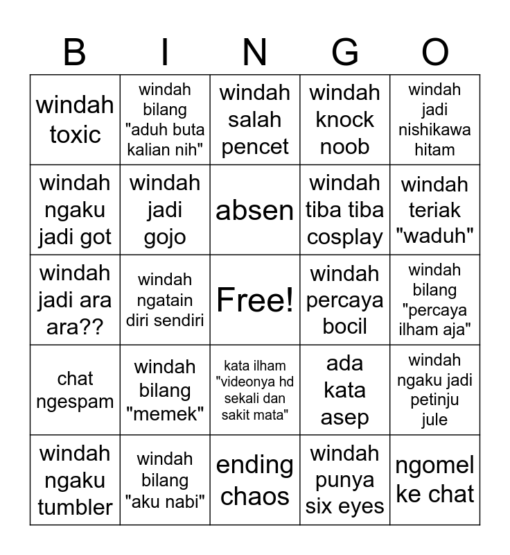 This bingo card has a free space and 24 words: windah bilang "memek", windah bilang "aku nabi", absen, windah ngaku tumbler, windah jadi nishikawa hitam, windah toxic, windah ngaku jadi got, windah bilang "aduh buta kalian nih", windah percaya bocil, kata ilham "videonya hd sekali dan sakit mata", windah tiba tiba cosplay, windah jadi ara ara??, ada kata asep, windah ngaku jadi petinju jule, windah jadi gojo, windah punya six eyes, windah bilang "percaya ilham aja", windah salah pencet, windah teriak "waduh", windah ngatain diri sendiri, ngomel ke chat, chat ngespam, windah knock noob and ending chaos.