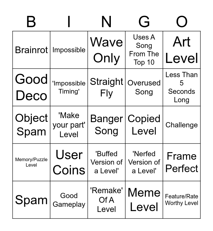 This bingo card has a free space and 24 words: User Coins, Good Gameplay, Straight Fly, Spam, Art Level, Brainrot, Good Deco, Impossible, Copied Level, 'Buffed Version of a Level', Overused Song, Object Spam, 'Nerfed Version of a Level', Frame Perfect, 'Impossible Timing', Meme Level, Challenge, Wave Only, Less Than 5 Seconds Long, 'Make your part' Level, Feature/Rate Worthy Level, Memory/Puzzle Level, Uses A Song From The Top 10 and 'Remake' Of A Level.
