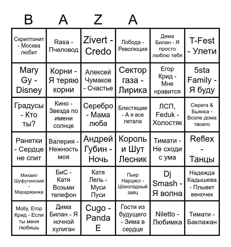 This bingo card has 60 words: Artik &Asti Под грустный денс, Король и Шут Лесник, Cream Soda - Никаких больше вечеринок, Блестящие - А я все летала, Reflex - Танцы, Комбинация - American boy, Mary Gy - Disney, Руки вверх - Ну где же вы, девчонки, Алексей Чумаков - Счастье, Владимир Маркин - Я готов целовать, Лобода - Революция, Xoliday - Мания, T-Fest - Улети, Molly, Егор Крид - Если ты меня любишь, Burito - По волнам, Скриптонит - Москва любит, Градусы - Кто ты?, Дима Билан - Я просто люблю тебя, Бумбокс - Вахтерам, Корни - Я теряю корни, Кино - Звезда по имени солнце, Zivert - Credo, Андрей Губин - Ночь, Валерия - Нежность моя, Дискотека Авария - Если хочешь остаться, Дима Билан - Я ночной хулиган, Dj Smash - Я волна, Гости из будущего - Беги от меня, Сектор газа - Лирика, Гости из будущего - Зима в сердце, Минаева - Шоколадка, Hi-Fi - Средняя школа № 7, Blizkey - Горы, Алла Пугачева - Позови меня с собой, Rasa - Пчеловод, БиС - Катя Возьми телефон, Три дня дождя - Отпускай, 5sta Family - Я буду, Cugo - Panda E, Егор Крид - Мне нравится, Miagy & Andy Panda -Kasandra, ЛСП, Feduk - Холостяк, Серебро - Мама люба, Ирина Аллегрова - Угонщица, Ранетки - Сердце не спит, Пьер Нарцисс - Шоколадный заяц, Uma2rman - Прасковья, Мурат Насыров - Мальчик Хочет в тамбов, Филипп Киркоров - Дива, Серега & Бьянка - Возле дома твоего, Тимати - Не сходи с ума, Серебро - Между нами любовь, Тимати - Баклажан, Катя Лель - Муси Пуси, Надежда Кадышева - Плывет веночек, Niletto - Любимка, Руки вверх - Крошка моя, София Ротару - Я назову планету именем твоим, Михаил Шуфутинский - Мараджанжа and Стас Михайлов - Все для тебя.