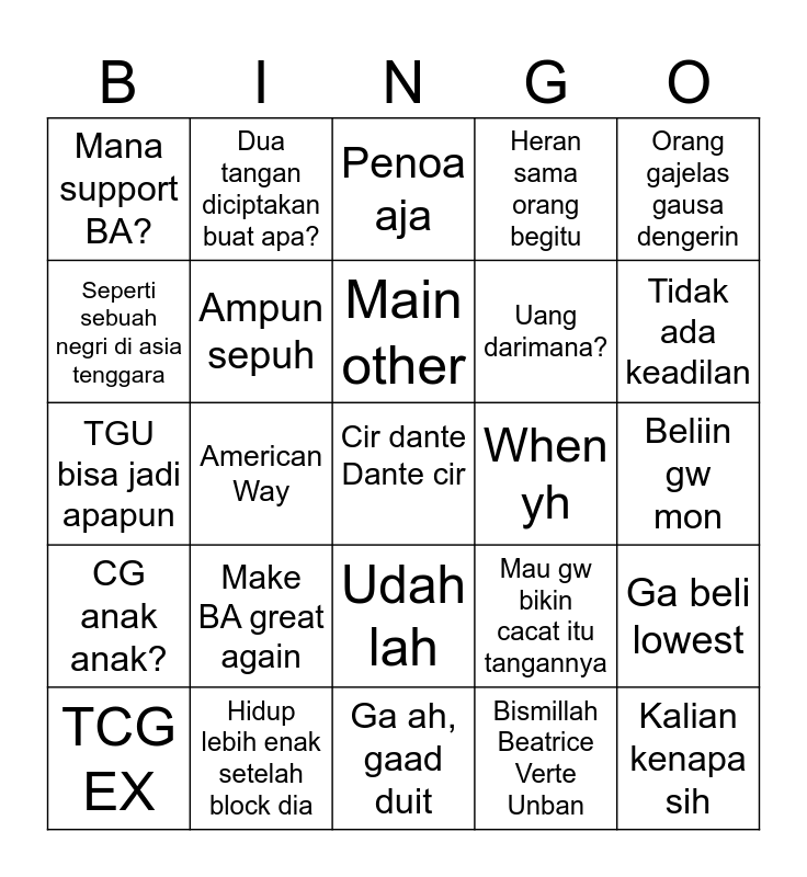 This bingo card has 25 words: CG anak anak?, Hidup lebih enak setelah block dia, Cir dante Dante cir, Bismillah Beatrice Verte Unban, Orang gajelas gausa dengerin, Mana support BA?, Dua tangan diciptakan buat apa?, Penoa aja, When yh, Ga beli lowest, Seperti sebuah negri di asia tenggara, Ampun sepuh, Ga ah, gaad duit, Mau gw bikin cacat itu tangannya, Tidak ada keadilan, TCG EX, American Way, Main other, Uang darimana?, Beliin gw mon, TGU bisa jadi apapun, Make BA great again, Udah lah, Heran sama orang begitu and Kalian kenapa sih.