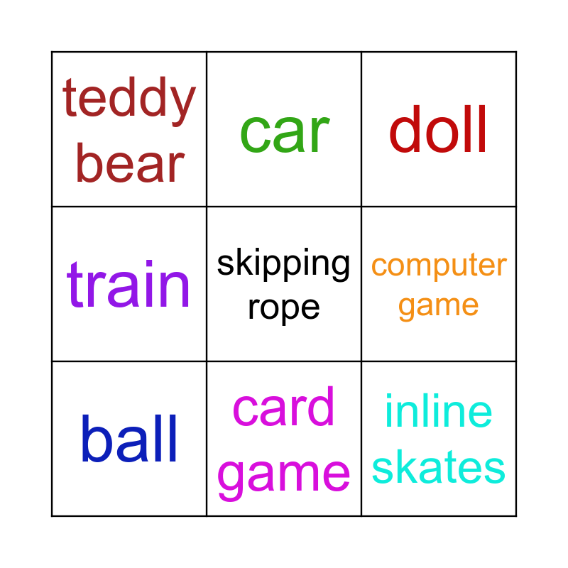 This bingo card has 9 words: ball, doll, car, train, teddy bear, computer game, skipping rope, inline skates and card game.