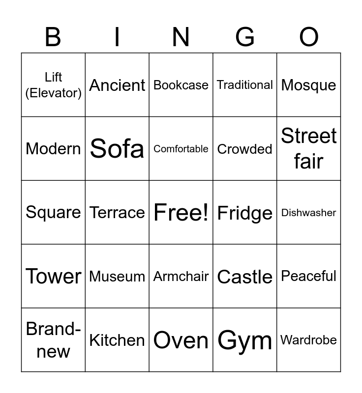 This bingo card has a free space and 30 words: Kitchen, Balcony, Terrace, Garage, Lift (Elevator), Bookcase, Sofa, Armchair, Fridge, Oven, Dishwasher, Wardrobe, Gym, Coast, Street fair, Art gallery, Castle, Tower, Museum, Mosque, Square, Sports centre, Ancient, Crowded, Modern, Traditional, Peaceful, Brand-new, Comfortable and Wooden.