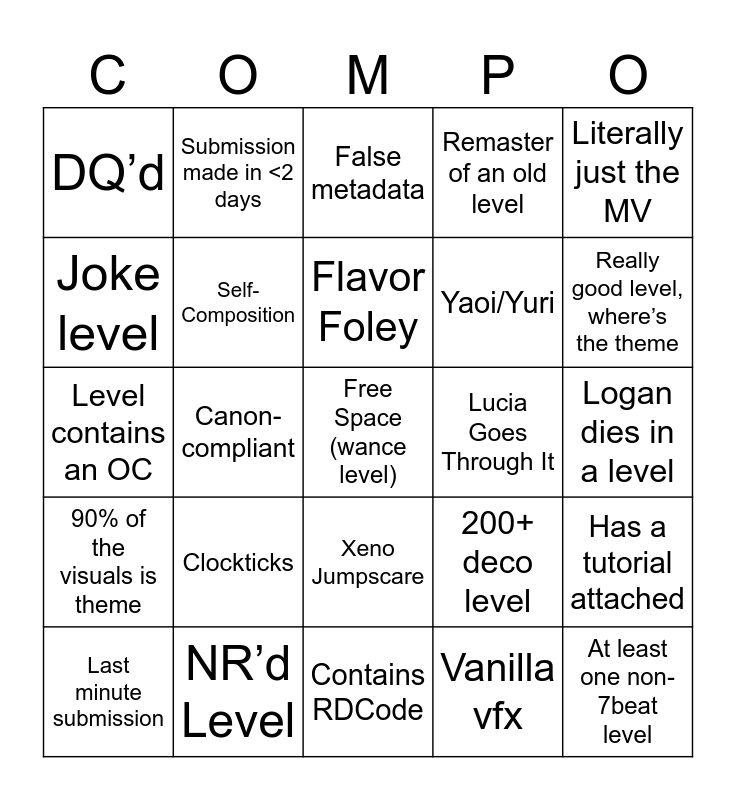 This bingo card has a free space and 24 words: Clockticks, NR’d Level, Flavor Foley, Last minute submission, Literally just the MV, DQ’d, Joke level, Submission made in <2 days, Lucia Goes Through It, Xeno Jumpscare, Yaoi/Yuri, Level contains an OC, 200+ deco level, Has a tutorial attached, Self-Composition, Vanilla vfx, Logan dies in a level, False metadata, Really good level, where’s the theme, Canon-compliant, At least one non-7beat level, 90% of the visuals is theme, Remaster of an old level and Contains RDCode.