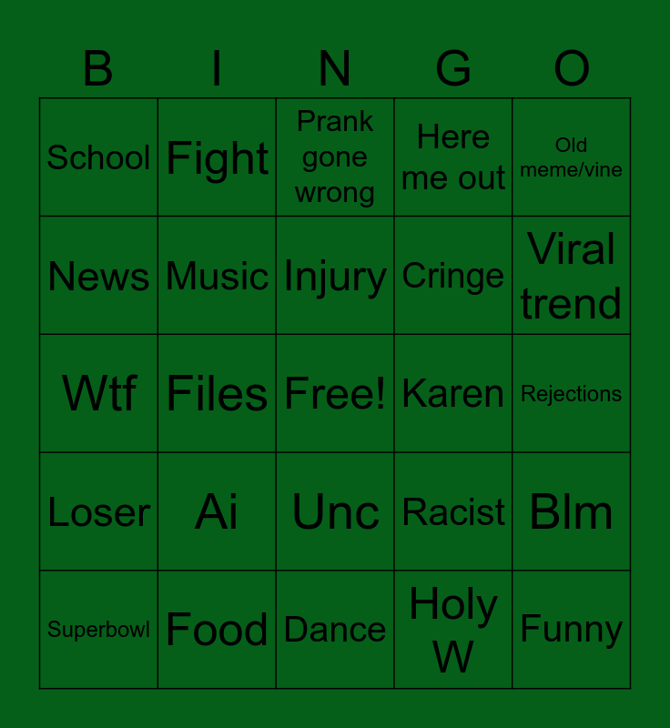 This bingo card has a free space and 24 words: Ai, Food, Injury, Superbowl, Old meme/vine, School, News, Fight, Karen, Unc, Cringe, Wtf, Racist, Blm, Music, Holy W, Rejections, Prank gone wrong, Viral trend, Files, Funny, Loser, Here me out and Dance.