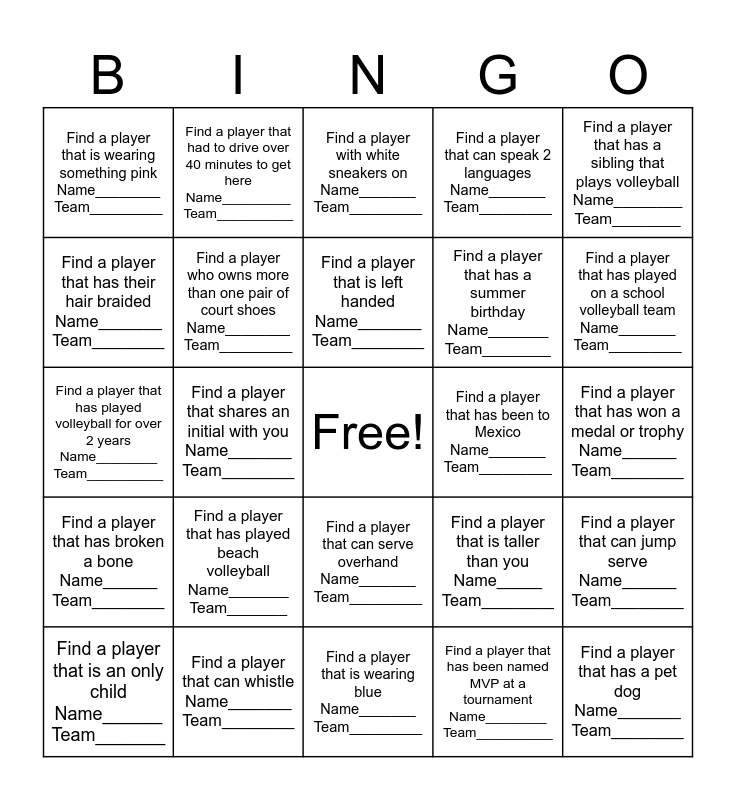 This bingo card has a free space and 24 words: Find a player that has played beach volleyball Name_______ Team_______, Find a player that can whistle Name_______ Team________, Find a player that is left handed Name_______ Team________, Find a player that is an only child Name______ Team_______, Find a player that has a sibling that plays volleyball Name________ Team________, Find a player that is wearing something pink Name________ Team_________, Find a player that has their hair braided Name_______ Team________, Find a player that had to drive over 40 minutes to get here Name_________ Team__________, Find a player that has been to Mexico Name_______ Team_________, Find a player that can serve overhand Name_______ Team_________, Find a player that has a summer birthday Name_______ Team________, Find a player that has played volleyball for over 2 years Name________ Team__________, Find a player that is taller than you Name_____ Team________, Find a player that can jump serve Name______ Team________, Find a player who owns more than one pair of court shoes Name________ Team_________, Find a player that has been named MVP at a tournament Name________ Team__________, Find a player that has won a medal or trophy Name______ Team________, Find a player with white sneakers on Name_______ Team_________, Find a player that has played on a school volleyball team Name_______ Team_________, Find a player that shares an initial with you Name_______ Team________, Find a player that has a pet dog Name_______ Team________, Find a player that has broken a bone Name______ Team________, Find a player that can speak 2 languages Name_______ Team_________ and Find a player that is wearing blue Name_______ Team_________.