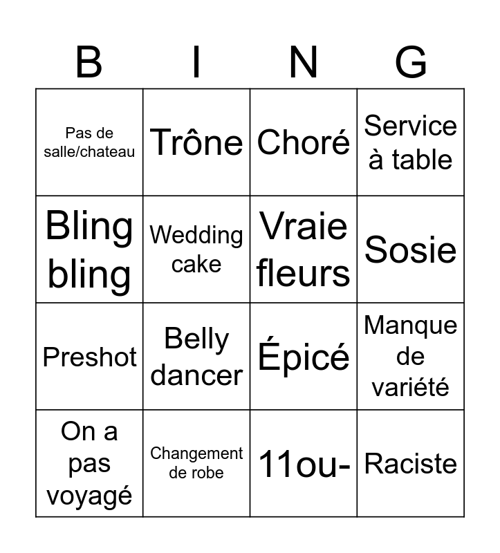 This bingo card has 16 words: On a pas voyagé, Changement de robe, Choré, Service à table, Bling bling, Trône, Épicé, Manque de variété, Pas de salle/chateau, Wedding cake, 11ou-, Sosie, Preshot, Belly dancer, Vraie fleurs and Raciste.