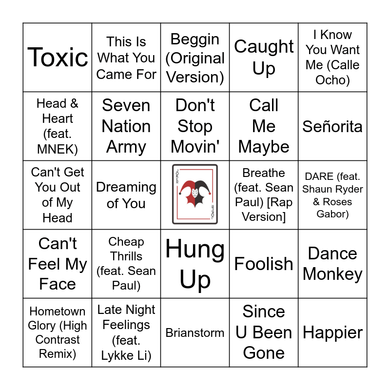 This bingo card has a free space and 31 words: Brianstorm, Mr. Brightside, Dreaming of You, Dakota, Toxic, Beggin (Original Version), Seven Nation Army, Foolish, Breathe (feat. Sean Paul) [Rap Version], Since U Been Gone, DARE (feat. Shaun Ryder & Roses Gabor), Happier, Giant, Take Me To Church, Señorita, This Girl, Dance Monkey, Cheap Thrills (feat. Sean Paul), Can't Feel My Face, Hung Up, I Know You Want Me (Calle Ocho), Hide U, Hometown Glory (High Contrast Remix), This Is What You Came For, Call Me Maybe, Head & Heart (feat. MNEK), Caught Up, Can't Get You Out of My Head, Late Night Feelings (feat. Lykke Li), Don't Stop Movin' and It Must Be Love (2009 Remaster).