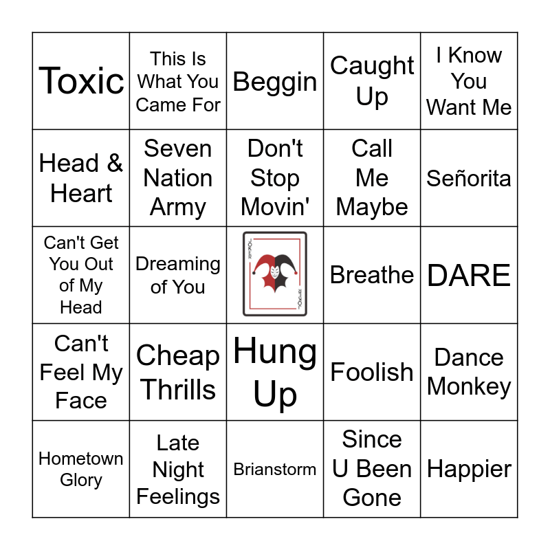 This bingo card has a free space and 31 words: Brianstorm, Mr. Brightside, Dreaming of You, Dakota, Toxic, Beggin, Seven Nation Army, Foolish, Breathe, Since U Been Gone, DARE, Happier, Giant, Take Me To Church, Señorita, This Girl, Dance Monkey, Cheap Thrills, Can't Feel My Face, Hung Up, I Know You Want Me, Hide U, Hometown Glory, This Is What You Came For, Call Me Maybe, Head & Heart, Caught Up, Can't Get You Out of My Head, Late Night Feelings, Don't Stop Movin' and It Must Be Love.