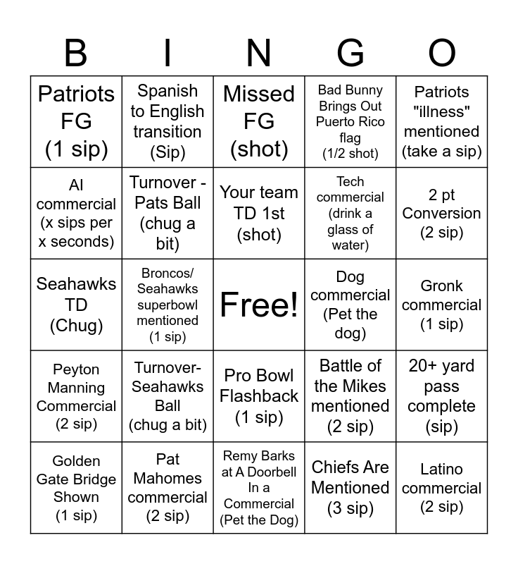 This bingo card has a free space and 29 words: Golden Gate Bridge Shown (1 sip), Bo Nix Is Mentioned (2 sips), Broncos/ Seahawks superbowl mentioned (1 sip), Seahawk FG (3 sip), Patriots FG (1 sip), Missed FG (shot), Turnover - Pats Ball (chug a bit), Turnover- Seahawks Ball (chug a bit), Dog commercial (Pet the dog), Pat Mahomes commercial (2 sip), Gronk commercial (1 sip), Latino commercial (2 sip), Remy Barks at A Doorbell In a Commercial (Pet the Dog), Chiefs Are Mentioned (3 sip), 2 pt Conversion (2 sip), Flacco mentioned (3 sip), Pro Bowl Flashback (1 sip), Peyton Manning Commercial (2 sip), Patriots "illness" mentioned (take a sip), Seahawks TD (Chug), Battle of the Mikes mentioned (2 sip), Superbowl 50 at this stadium mentioned (4 sip), Tech commercial (drink a glass of water), AI commercial (x sips per x seconds), Bad Bunny Brings Out Puerto Rico flag (1/2 shot), Spanish to English transition (Sip), 20+ yard pass complete (sip), Your team TD 1st (shot) and Coach Screams At Ref (shot).