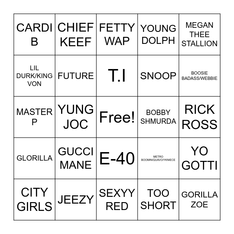 This bingo card has a free space and 24 words: GUCCI MANE, JEEZY, T.I, CITY GIRLS, MEGAN THEE STALLION, CARDI B, LIL DURK/KING VON, CHIEF KEEF, BOBBY SHMURDA, E-40, SNOOP, MASTER P, METRO BOOMIN/QUAVO/YKNIECE, YO GOTTI, FUTURE, TOO SHORT, RICK ROSS, FETTY WAP, BOOSIE BADASS/WEBBIE, YUNG JOC, GORILLA ZOE, GLORILLA, YOUNG DOLPH and SEXYY RED.