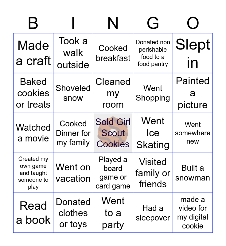 This bingo card has a free space and 24 words: Went on vacation, Donated clothes or toys, Cleaned my room, Read a book, Slept in, Made a craft, Baked cookies or treats, Took a walk outside, Went Ice Skating, Played a board game or card game, Went Shopping, Watched a movie, Visited family or friends, Built a snowman, Shoveled snow, Had a sleepover, Went somewhere new, Cooked breakfast, Painted a picture, Cooked Dinner for my family, made a video for my digital cookie, Created my own game and taught someone to play, Donated non perishable food to a food pantry and Went to a party.
